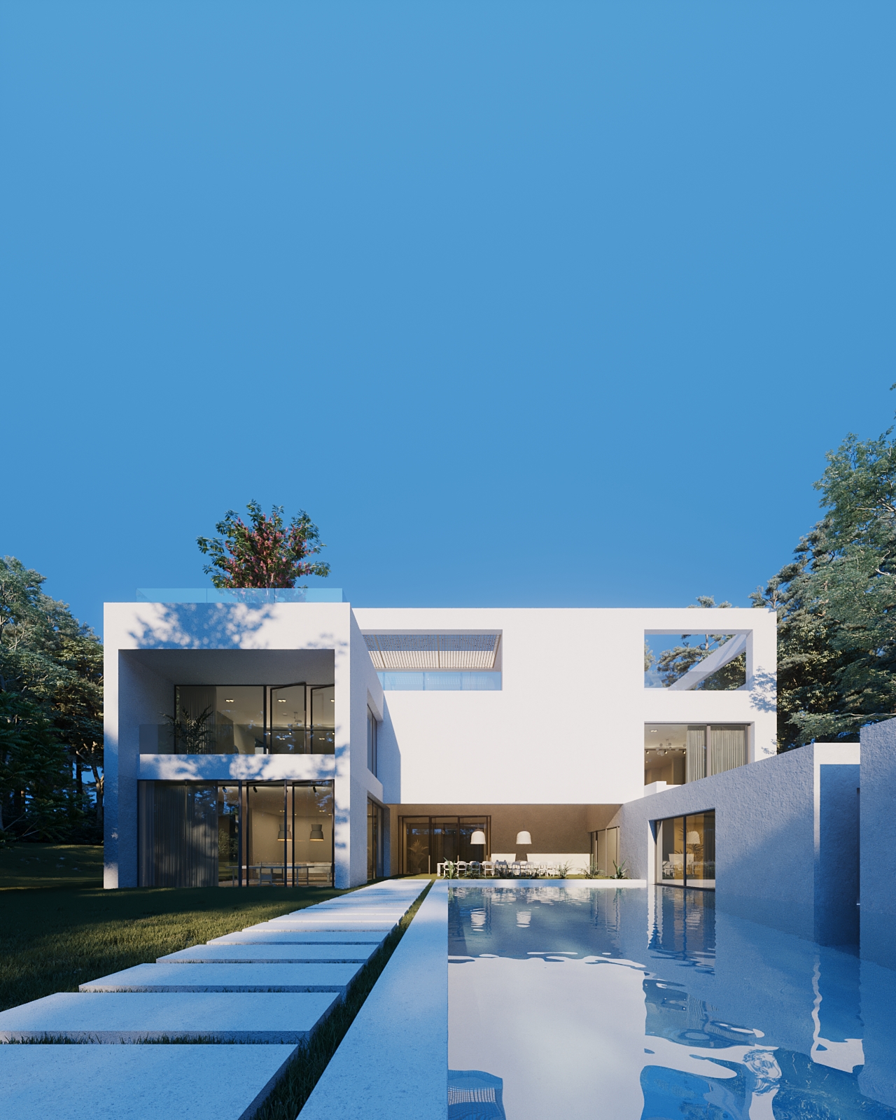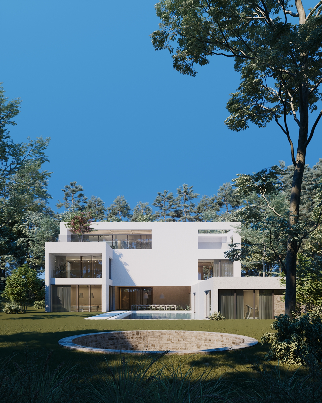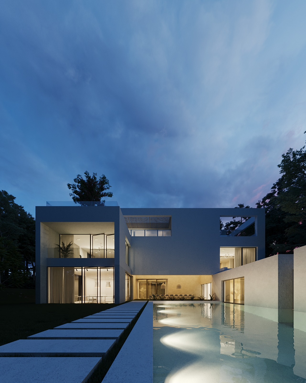 The villa’s aesthetic is composed of robust interlocking cubic forms, a geometric dance of clean lines and minimalist beauty. The structure’s stark white façade contrasts harmoniously with the lush greenery of its surroundings, asserting itself as both a focal point and a respectful complement to the natural beauty of the landscape.